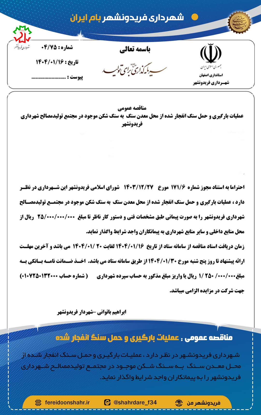 ۱۴۰۴/۰۵/۰۷مزایده : یک پلاک زمین با کاربری مسکونی#مزایده #زمین_با_کاربری_مسکونی ✍️ شهرداری فریدونشهر در نظر دارد یک پلاک…ادامه خبر